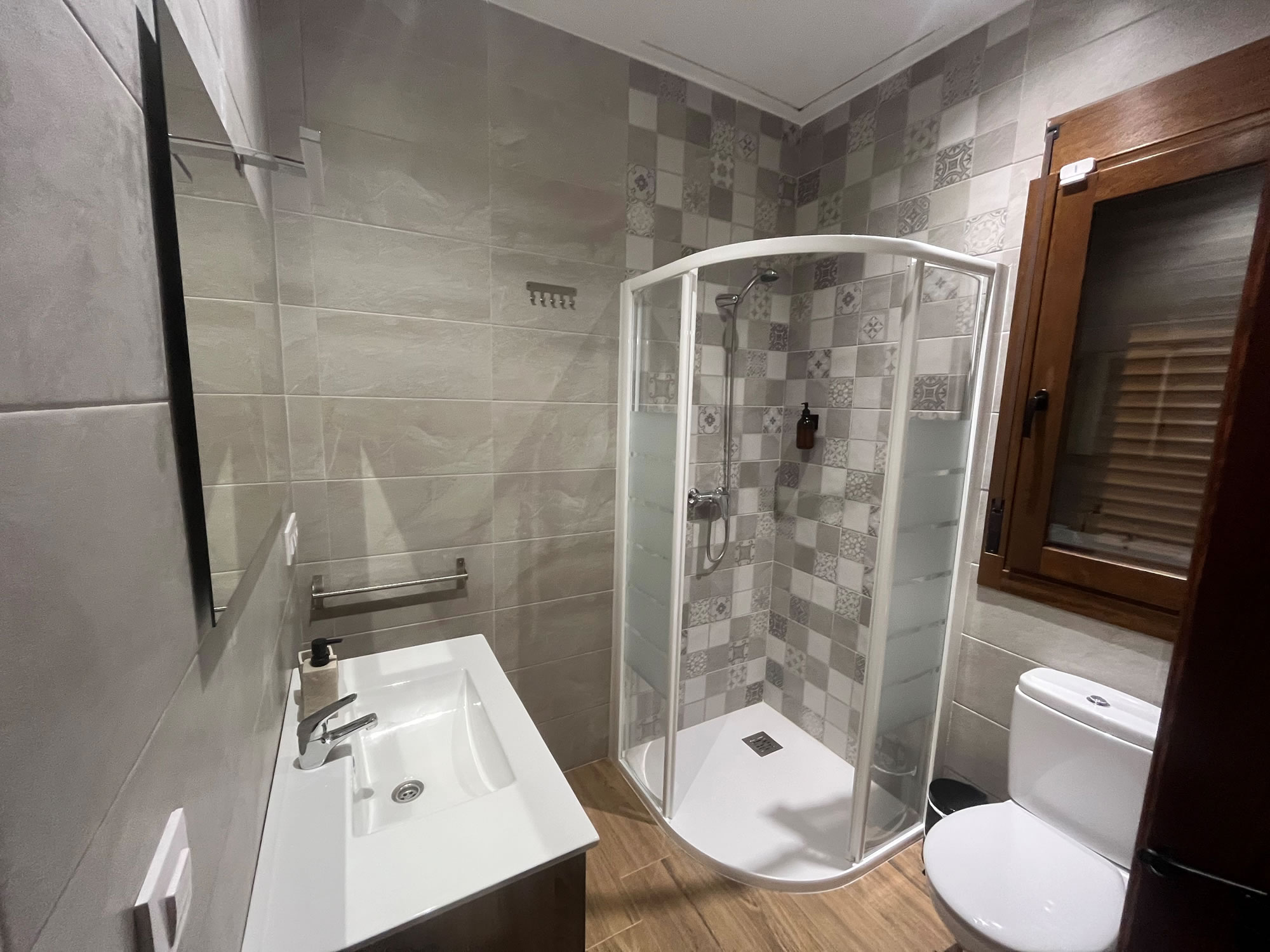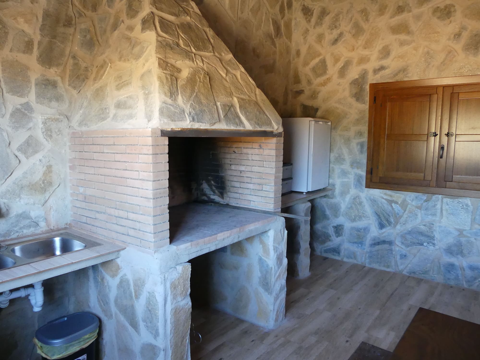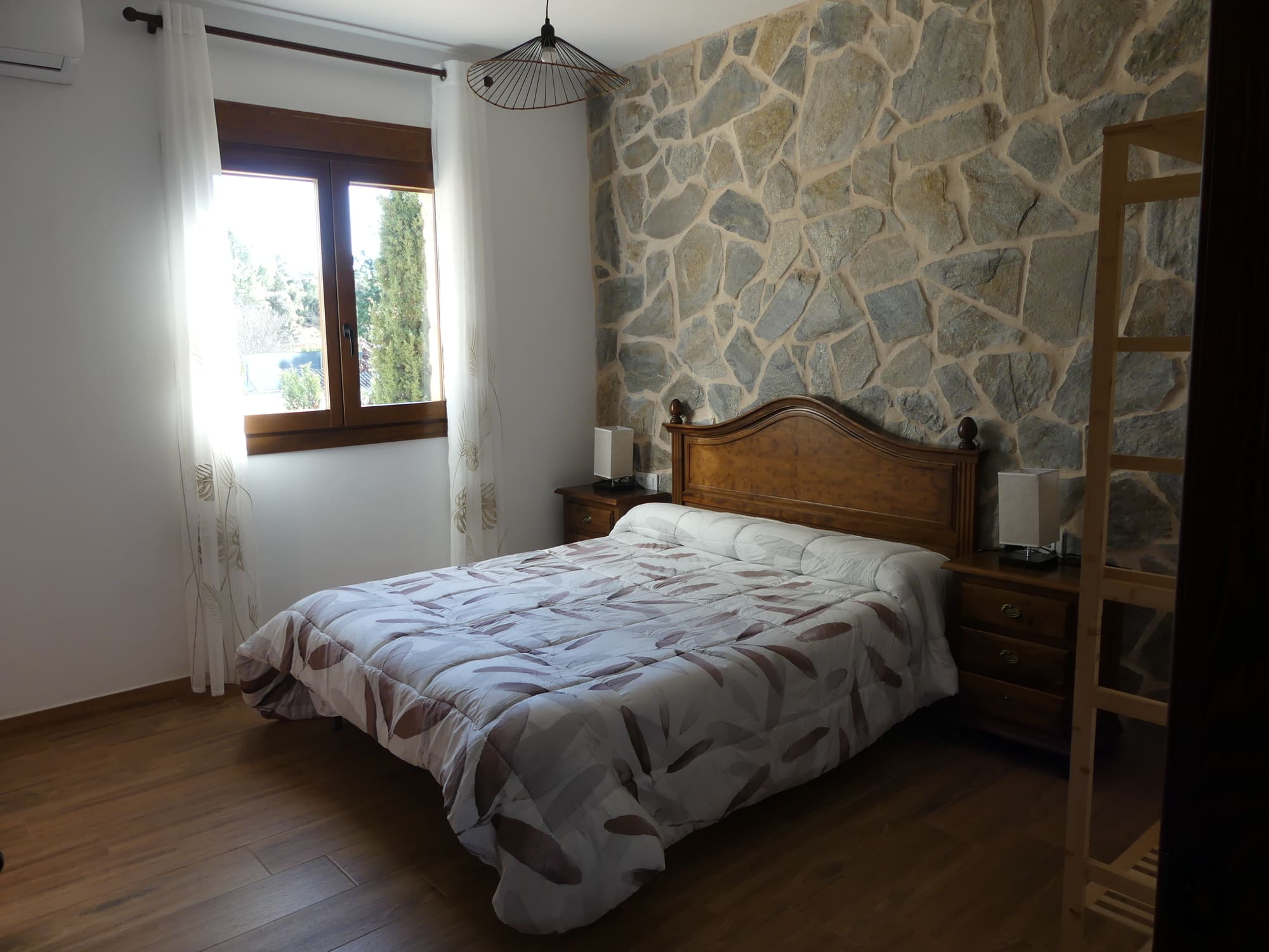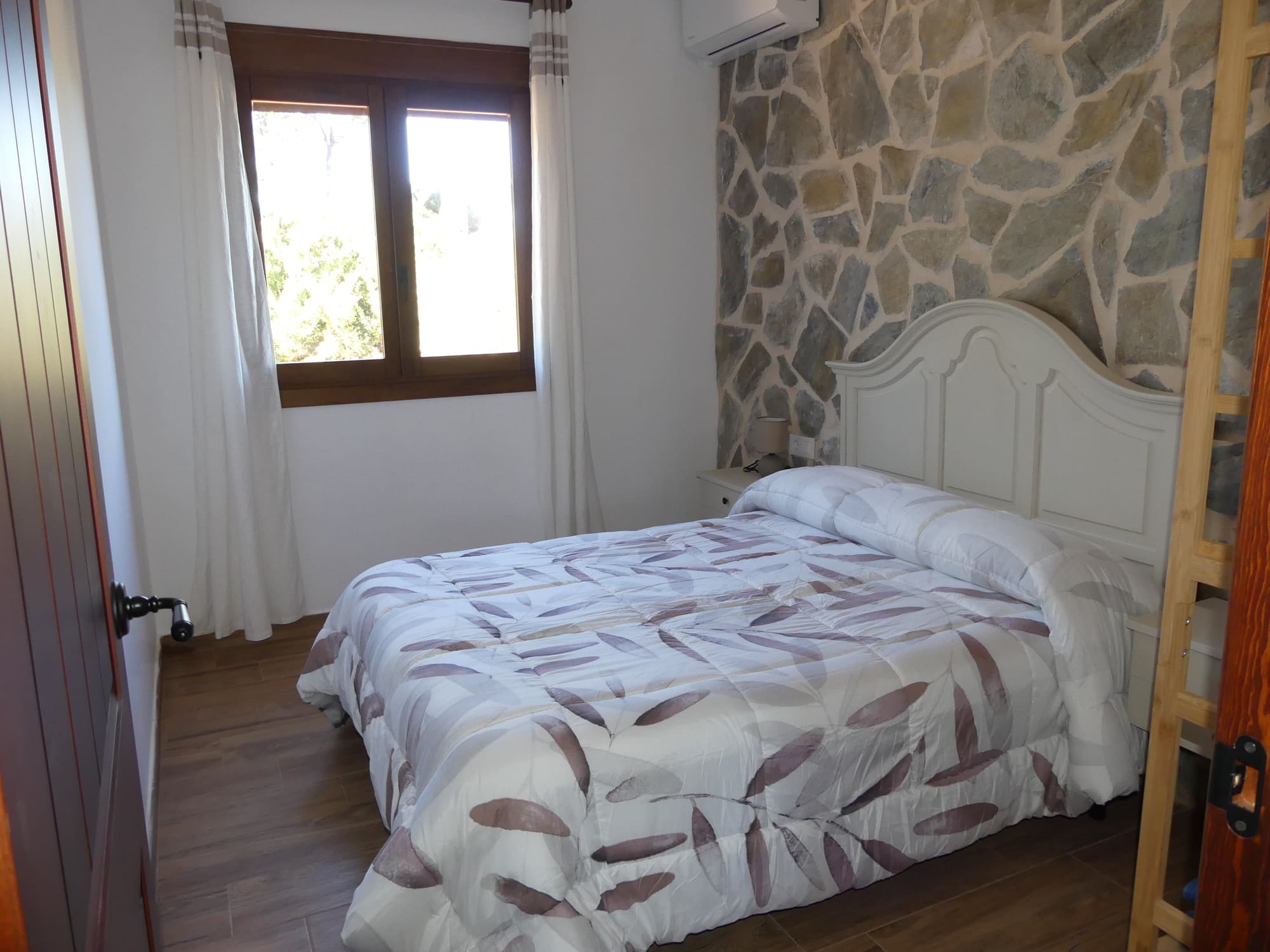 La vivienda completa se encuentra en una sola planta, a la que se accede por escalera o rampa, ubicada estratégicamente en altura para no perder las maravillosas vistas que ofrece el entorno. Dispone de salón con chimenea y amplios ventanales que permiten disfrutar de las bellas vistas. Cuenta con cocina completamente equipada (vitrocerámica, frigorífico con congelador, lavavajillas, lavadora, horno, microondas, exprimidor, batidora, tostadora, cafetera italiana y amplio menaje de cocina). La vivienda tiene 3 habitaciones, 1 habitación de matrimonio con baño individual, 1 habitación de matrimonio y 1 habitación con dos camas individuales, 2 baños y lavadero. La casa goza de terraza exterior con vistas a la montaña y jacuzzi.